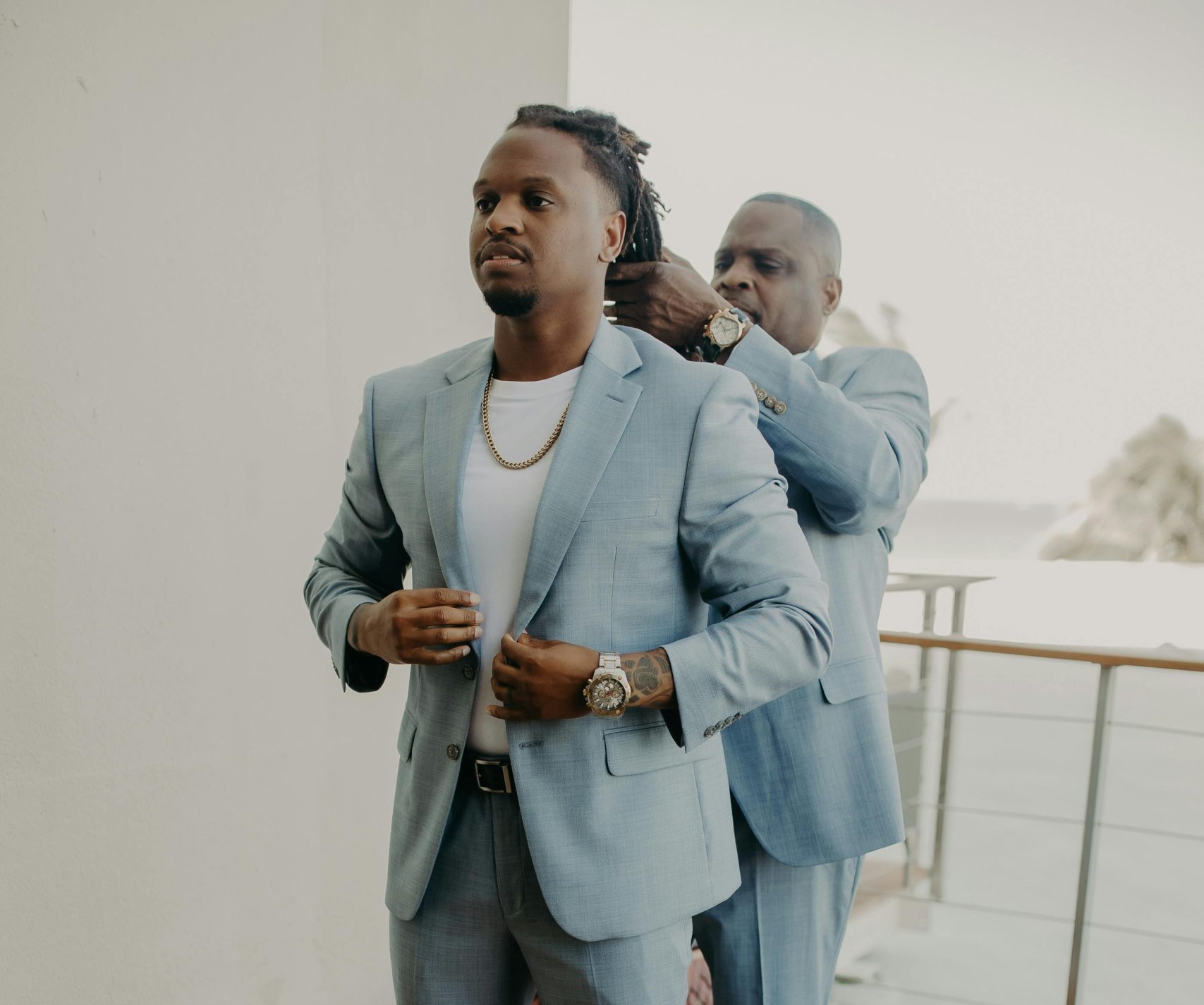 Compliment your son on his wedding-day look and make him feel confident and ready to take to the alter. This is a special moment to give him some marital advice.